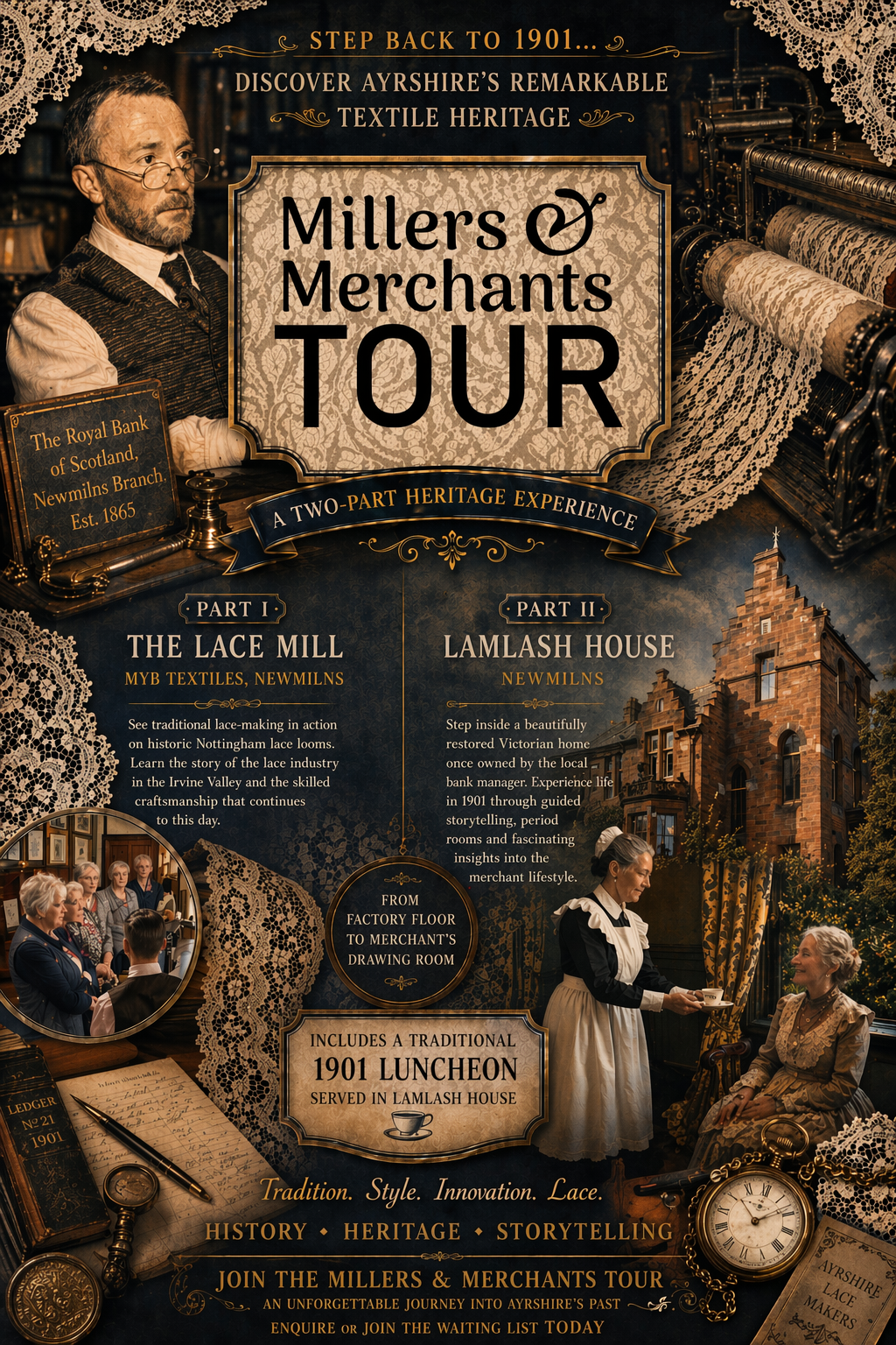 Tasting History Ayrshire Tours (THAT co.) presents the Millers and Merchants Tour - an opportunity to obtain a unique glimpse into the fascinating history of Ayrshire's textile and lace production and to visit a current lace manufacturer who is still utilising original Victorian methods. It is also an opportunity to visit a Grade B Historic Building, formerly an operational bank for 124 years and adjoining bank manager’s house which has links with the lace industry.