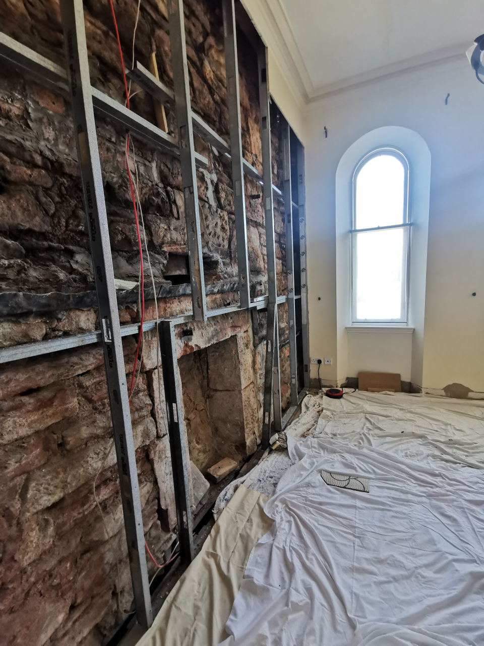 Unfortunately, prolonged water ingress during the winter months caused damage to the interior of the house, most notably in the tower section. One internal wall, severely compromised by water ingress has now been carefully dismantled. We are pleased to share that reinstatement of this wall has recently begun—marking a key milestone in our internal restoration programme.